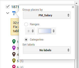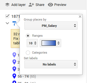 11-Click Uniform style and click Group places by, then select PM_Salary under Style by data column to color the data points based on salary categories.