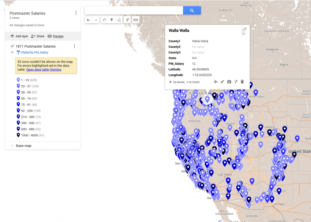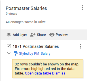 - When we uploaded our data to My Maps, an error message said 32 rows could not be shown on the map. Open the data table and explore what patterns or discrepancies you can find for these rows. Why can’t the mapping program visualize this data? What would be involved in editing the data to make these rows display on the map?