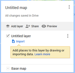 9-At the bottom of the pop-up in the top left-hand corner is a Base map icon with a dropdown icon. You can explore different available base maps to see what works best with your data. For example, My Maps’s default base map includes topographical data. If that data is not essential for our analysis, a simpler base map (like Simple Atlas) can help users focus on the most important aspects of the spatial visualization.