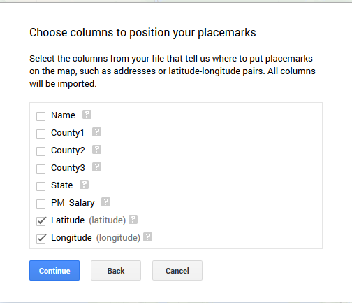 5-Check that only Latitude and Longitude are selected before clicking Continue. My Maps will keep all the original data records but needs to detect which fields contain spatial data.