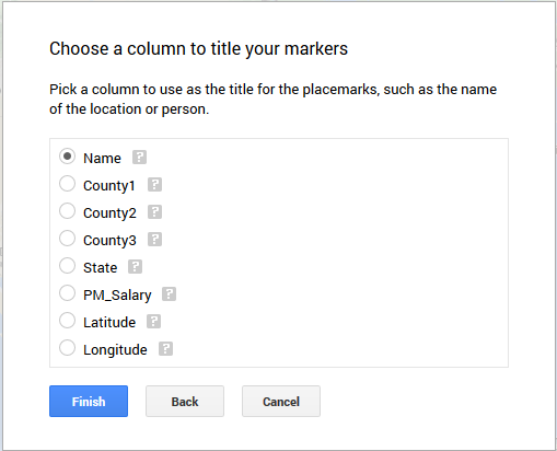 6-The next screen asks what field you want to use for the place marker titles. Select Name and click Finish.