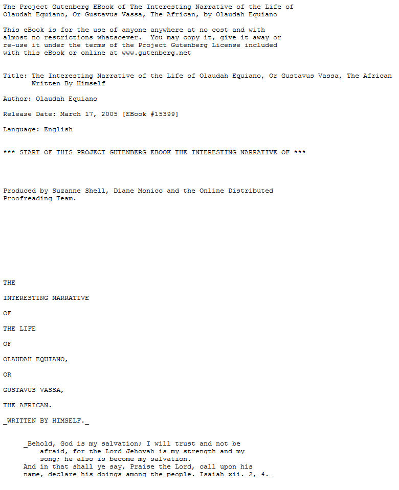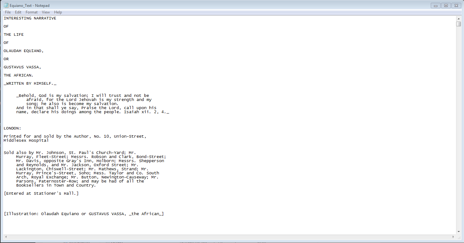1- Navigate to http://sarahjpurcell.sites.grinnell.edu/digital_methods/files/Equiano_Text.txt in a web browser and save the “Equiano_Text” text file to your Desktop.. Open Equiano.txt to see the plain text utf-8 file downloaded from Project Gutenberg.