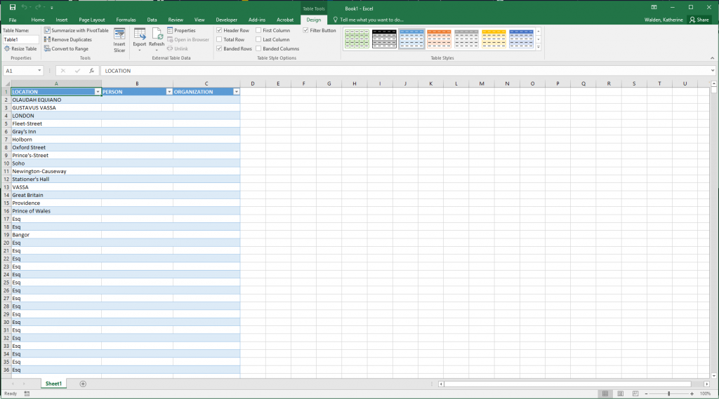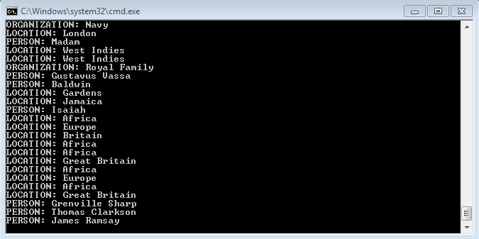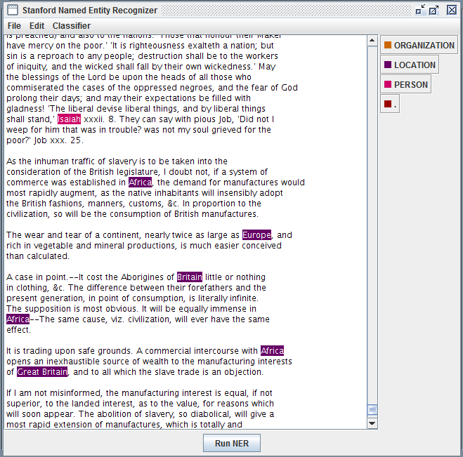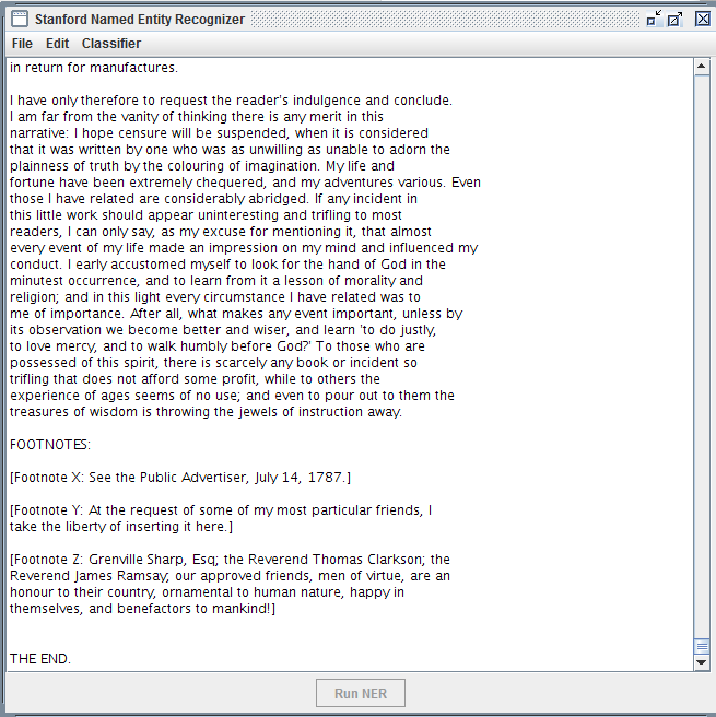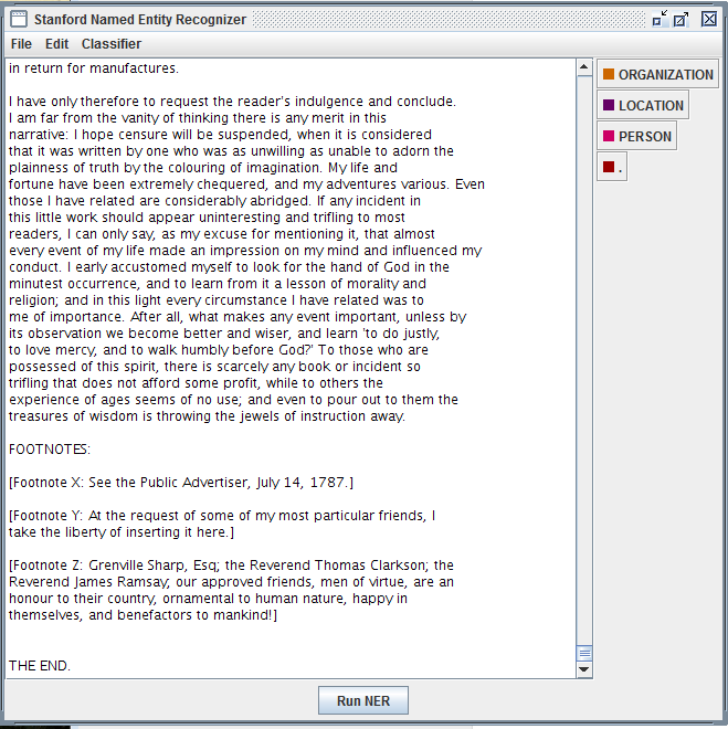 Developed in 2006 by a team based out of Stanford University’s National Language Processing Group, the Stanford Named Entity Recognizer (NER) is a Java-based tool for recognizing and extracting named entities in an unstructured textual dataset. In this tutorial, we’ll be using Stanford’s NER to identify named entities in The Interesting Narrative of the Life of Olaudah Equiano, Or Gustavus Vassa, The African, an autobiographical slave narrative published in 1789.