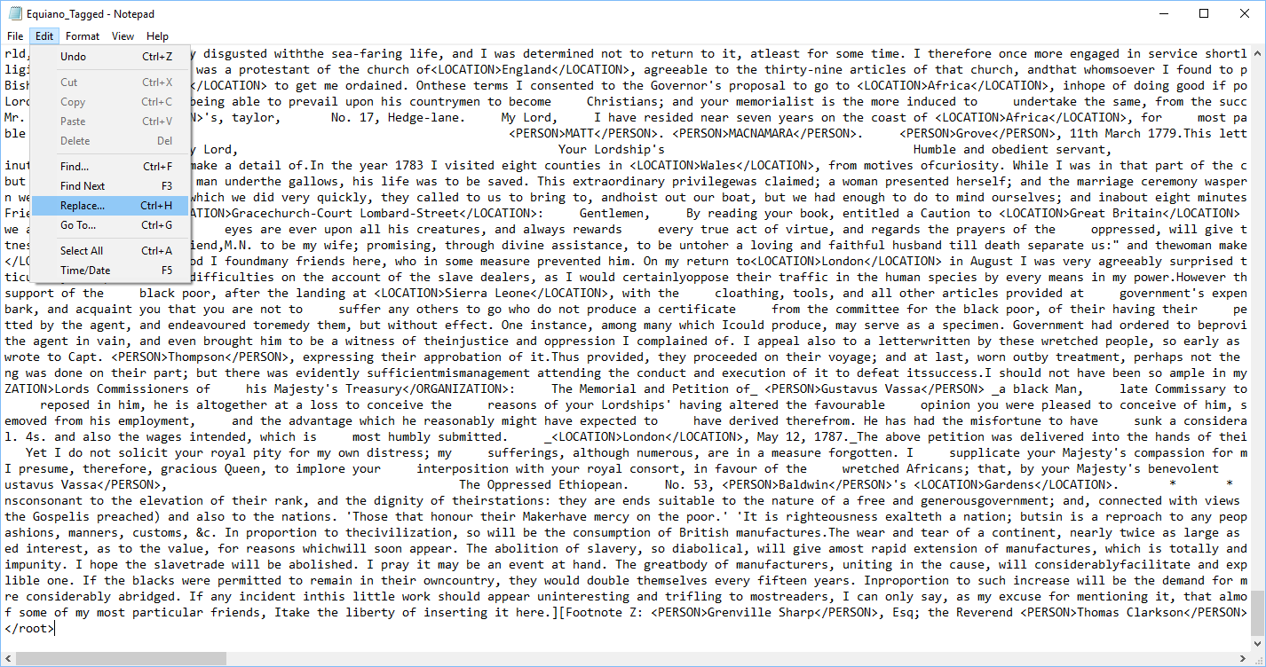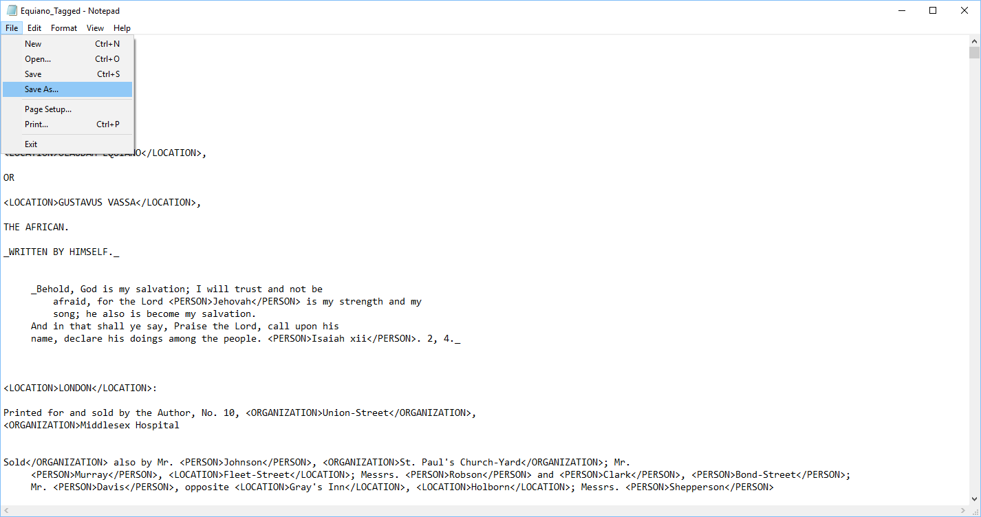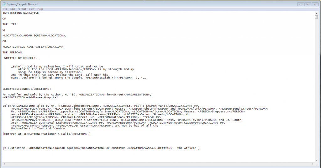22-Open the Equiano_Tagged.txt file in Notepad. Click File—Save As to save a second copy of the NER output.