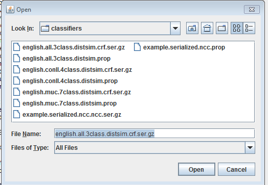 11-Click Classifier->Load CRF from File. Navigate to C:\Program Files (x86)\Stanford NER\classifiers and open the classifiers folder.