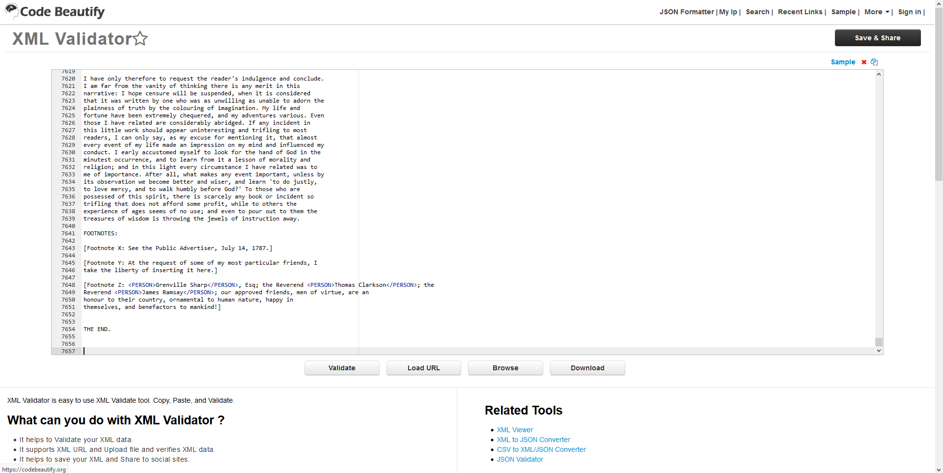 26-Copy the text in the Equiano_Tagged file, and paste it into the XML validator. Click Validate to check your XML.