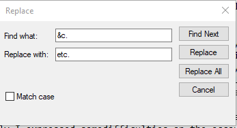 32-Go to Edit—Replace in Notepad. Instruct the program to find all instances of “&c.” and replace them with “etc.”. Click Replace All.